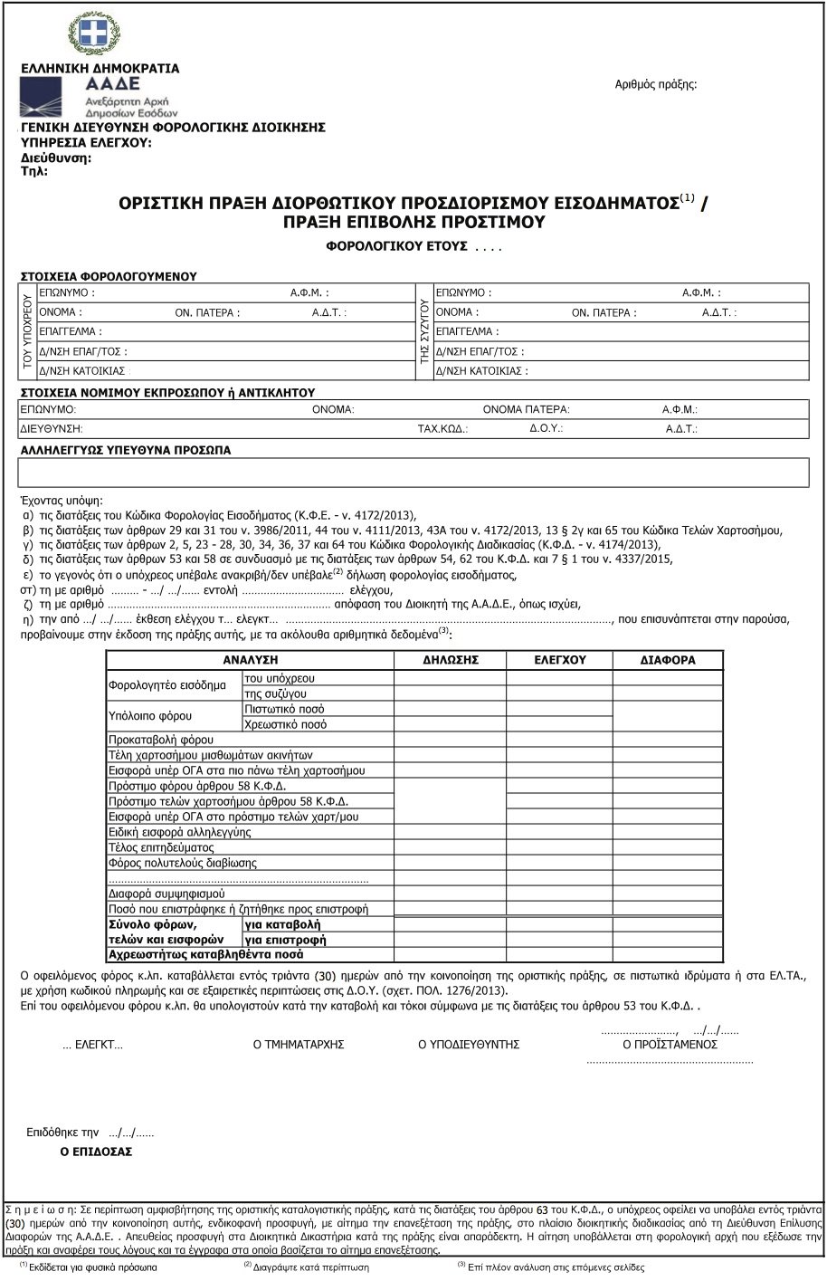 Τύπος Οριστικής Πράξης διορθωτικού προσδιορισμού φόρου εισοδήματος και πράξης προστίμου για φυσικά πρόσωπα, που αφορούν φορολογικά έτη 2014 και επόμενα.